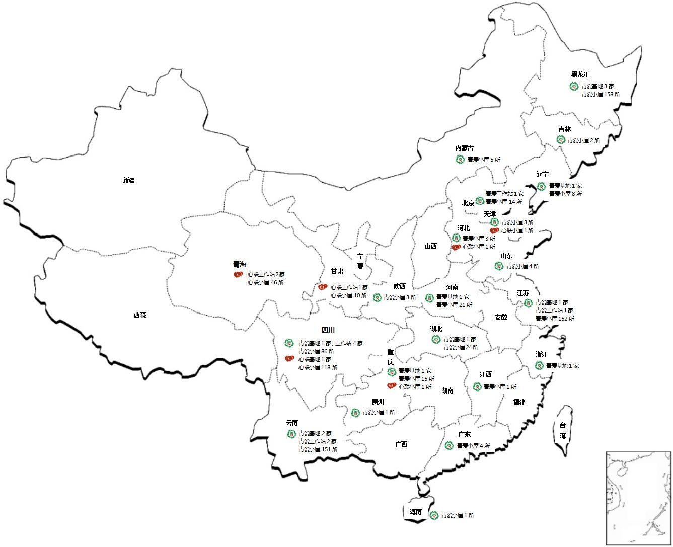 青爱工程工作站19家:成都市青羊区工作站(001号)、云南省盈江县工作站(002号)、成都市龙泉驿区工作站(003号)、成都市金牛区工作站(004号)、自贡市沿滩区工作站(005号)、南通市崇川区工作站(006号)、玉溪市元江县(007号)、北京市丰台区(008号)、大庆市教育局直属学校(009号)、大庆市让胡路区(010号)、大庆市萨尔图区(011号)、大庆市龙凤区(012号)、大庆市红岗区(013号)、大庆市大同区(014号)、大庆市肇州县(015号)、大庆市肇源县(016号)、大庆市林甸县(017号)、大庆市杜蒙县(018号)、茂名市滨海新区(019号)。