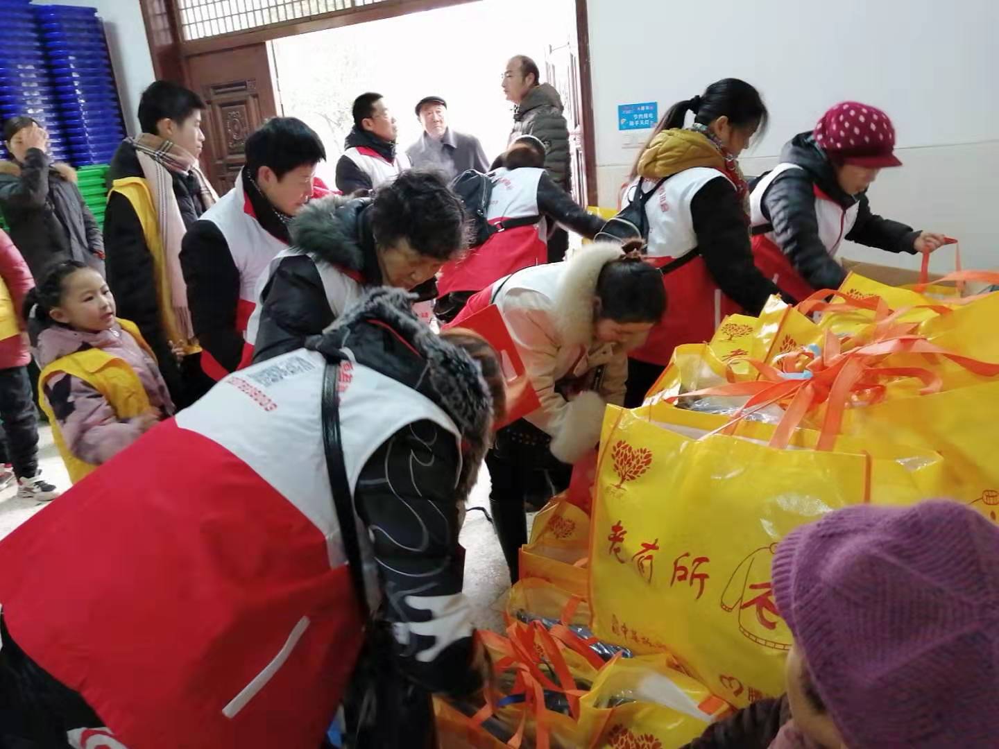 活动二:给九垅村65岁以上的老人发放170件棉衣,护膝护腰,对联。